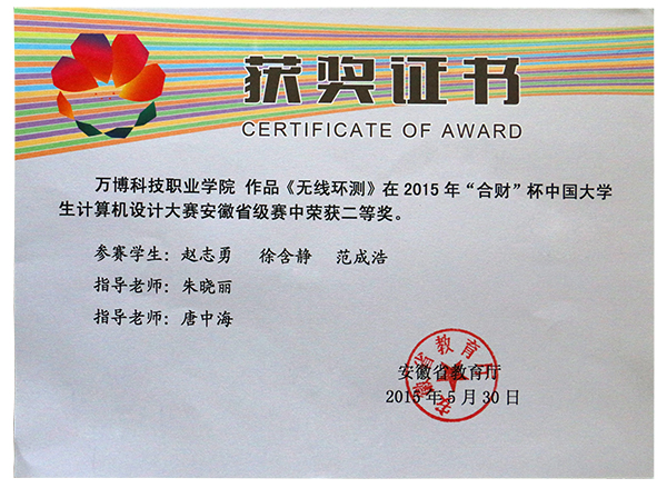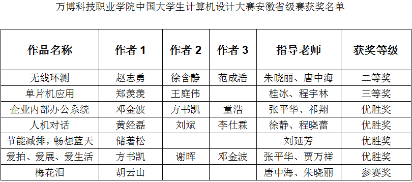 2015中国大学生计算机设计大赛安徽省级赛(含计算机设计、程序设计、单片机、机器人四个赛项)已经结束🛌🏽。由2013级计算机网络技术专业赵志勇👩🏿🚒、徐含静、范成皓三位同学在唐中海🧑🏻🏫、朱晓丽两位老师的指导下完成的参赛项目《无线环测》荣获2015年“合财”杯中国大学生计算机设计大赛安徽省级赛二等奖的好成绩🌝,由2013级通信技术专业郑羡羡、2013级应用电子技术专业王庭伟组成的彩神代表队在“炜煌杯”2015安徽省大学生单片机应用技能竞赛上同样表现不俗📤,在桂冰🪫🏐、程宇林两位老师的指导下最终荣获三等奖的好成绩。此外,我院提交的《企业内部办公系统》🐻、《人机对话》等作品荣获大赛5项优胜奖以及1项参赛奖。
