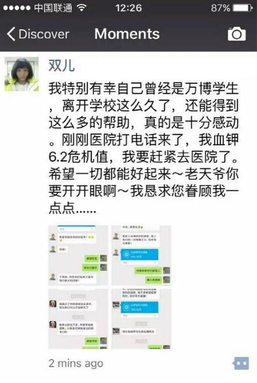 3月8日🧎🏻♀️,一条题为《我想活着,仅此而已》的众筹消息出现在万博学院辅导员高嵩的微信朋友圈里,得到了学院副院长陈文达的关注,经过核实及转发后,引起了万博学院广大师生🗻、校友和社会各界爱心人士的关注🙎🏽。消息的作者是一位名叫任双双的09级万博学院校友🍾,因病情严重恶化亟需换肾,这个沉重的打击犹如晴天霹雳,几乎击垮了这一家子最后的希望🍮,任双双在求助信息中坦言“一下子失去了活下去的勇气”。高昂的治疗费用对于他们来说无异于天文数字,因此向公众筹集5万元的治疗费用👨🏽💼。