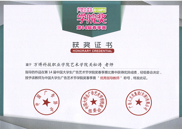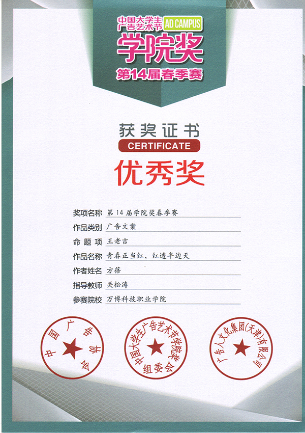 在此次比赛中👈,我院艺术分院广告学教研室积极组织学生参赛,其中广告设计与制作专业方蓓和余家乐两位同学分别获得本次大赛广告文案写作优秀奖,广告设计与制作专业的王于卉同学获得了本次大赛广告文案写作佳作奖,我院艺术分院广告学教研室主任关松涛荣获第14届中国大学生广告艺术节学院奖“优秀指导教师”奖。