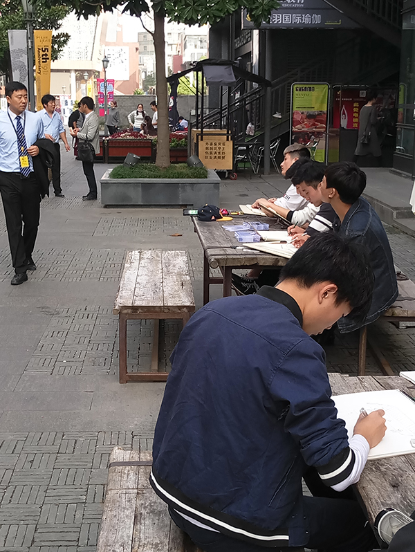 10月17日,2015级室内设计班62位师生乘坐校车,来到有着“城市的名片”美誉的 “1912”进行景观造型速写的写生课,在这个现代和传统风格并存的概念街区里,同学们拿起速写本🕢、占有利角度、寻找透视点,不一会儿马头墙、雕花门栏、小资情调的餐厅就在寥寥数笔中呈现出来🧍🏻♀️。手绘课程需有完整的课程体系,线条、单体👩、小品的练习,到线稿、色稿的临摹最后写生环节👧🏽,训练室内专业学生的手绘创作能力🤷♂️,训练学生能提笔就画动手来操作软件的实战能力🧲。