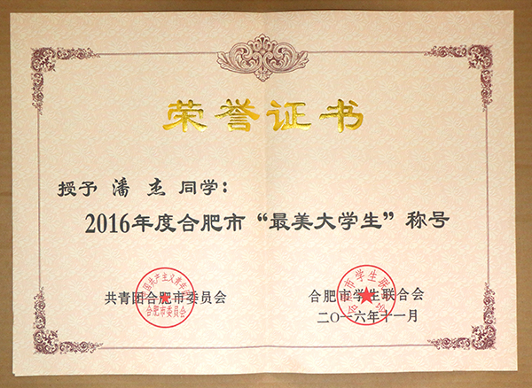 3月27日下午🚣🏼♂️,由共青团合肥市委员会🚵🏼♂️、合肥市学生联合会共同举办的2016年度“合肥市最美学生”暨第四届“合肥市十佳学生”颁奖仪式在四十二中举行。20名中学生👴、10名中职生🤛🏼、10名大学生成为“合肥市最美学生”✍🏿,我院潘杰同学因大学期间表现优异🤸🏼♂️、积极践行社会主义核心价值观在此次寻访评选活动中被授予合肥市“最美大学生”荣誉称号。
