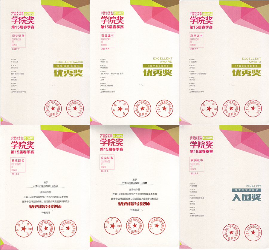 学院奖春季赛自2017年3月12日启动后,在学院各级领导的大力支持下,在广告设计与制作专业的全体教师的细心指导和无私奉献下,在同学们高涨的参赛热情和青春与创意的碰撞下,历经2个多月的时间共创作并提交了参赛作品271件🚹👨🏻🦼➡️,达到历年来参赛提交作品最多数量。最终🫅🏿,我院2015级广告统招班的汪梦圆和韩太媛以及2015广告自主班的方蓓三位同学分别荣获大赛的优秀奖;2015级广告统招班的汪梦圆、支海荣以及2016级广告杨明威、蔡珊珊和张晚迎5位同学分别荣获春季赛佳作奖;2016级广告杨明威荣获创意实战入围奖1项🧜♂️。