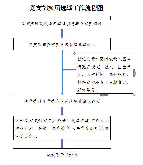 为进一步加强基层党组织建设,更好地发挥党支部的战斗堡垒作用,把新形势下从严治党的各项要求真正落到实处,根据《中国共产党章程》和《中国共产党基层组织选举工作暂行条例》规定,结合我院实际📒,对各党支部开展换届选举。为保证换届工作的顺利进行,制定如下方案: