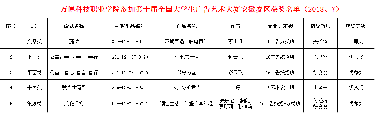 7月20日🧑🏻🦲,由教育部高等教育司指导、安徽省教育厅主办、合肥工业大学承办的第十届全国大学生广告艺术大赛(简称“大广赛”)安徽分赛区评审结果公示揭晓1️⃣,我院荣获三等奖1项和优秀奖4项👨🏻🎓。