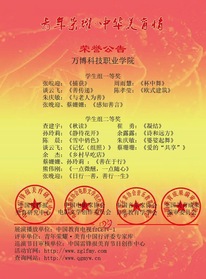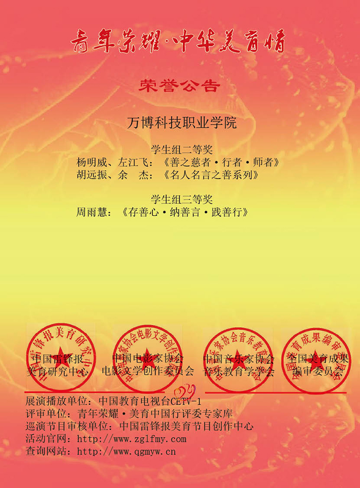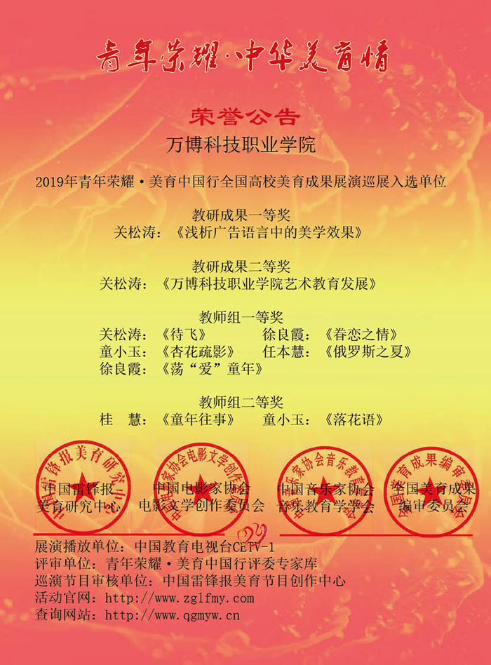 12月24日👮🏿,从主办方传来喜讯,在由中国雷锋报美育研究中心、中国电影家协会电影文学创作委员会、中国音乐家协会音乐教育学学会⚱️、全国美育成果编审委员会联合主办的“2019年青年荣耀•中华美育情全国高校美育成果展演”比赛中,我院师生提交的参赛作品喜获佳绩。