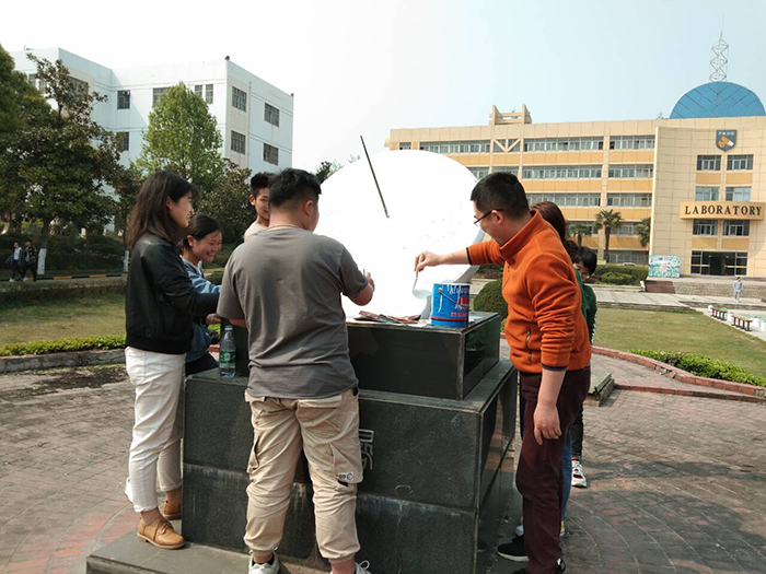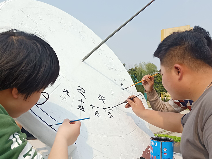 芳菲春日暖,为了用手中的画笔扮靓春日校园🆕,4月3日下午7️⃣,艺术分院院长副刘静,教研室主任关松涛,学工助理🧜🏿、学生社联美术协会指导老师水九清以及美术协会会长杨世豪等师生🕵🏿♂️,在学院南门为学院标志性建筑物日晷重新换新装。