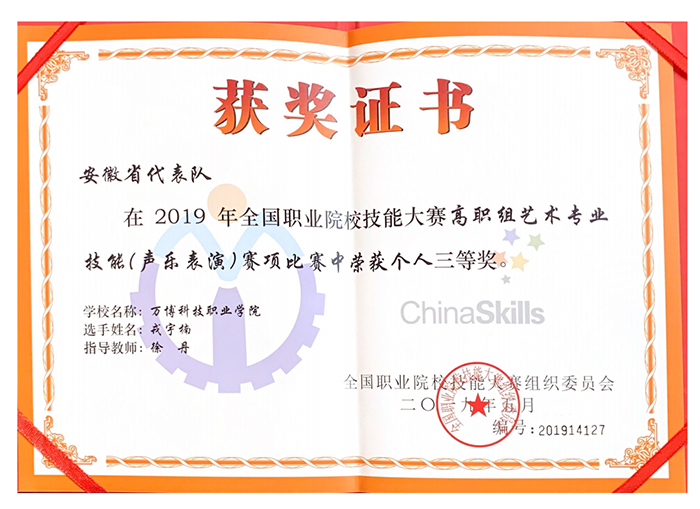 5月27-31日,2019年全国职业院校技能大赛高职组艺术专业技能(声乐表演)赛项在北京戏曲艺术职业学院成功举办,我院2016级音乐表演专业学生戎宇楠同学代表安徽省参加国赛,并取得个人三等奖的好成绩,实现了历史性的突破👩🎨。