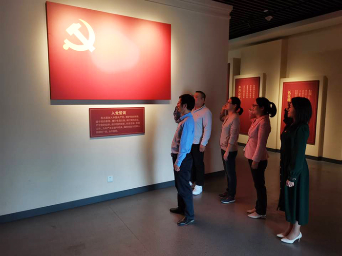 在博物馆一楼大厅,面对鲜艳的党旗,支部宣传委员裴孝清同志带领全体党员一起重温入党誓词,表达共产党人“不忘初心🦕、牢记使命”的坚定政治信念,立下“初心如磐,使命在肩”的铮铮誓言。