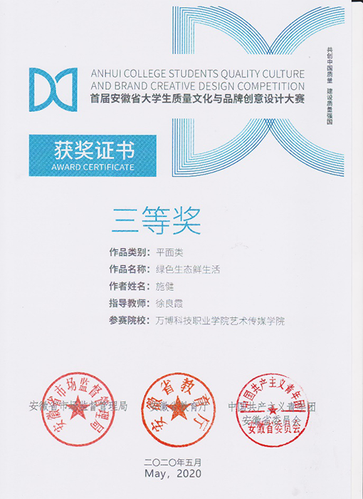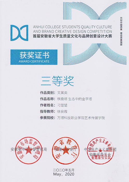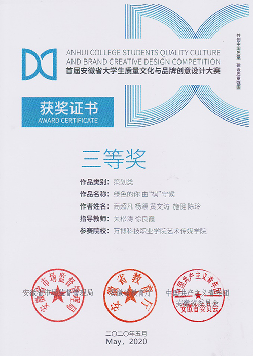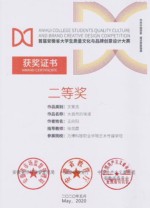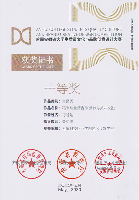 近日,在安徽省市场监督管理局 安徽省教育厅 中国共产主义青年团安徽省委员会关于公布首届安徽省大学生质量文化与品牌创意设计大赛获奖名单的通知中,彩神报送的136件参赛作品中,最终斩获大赛一等奖两项、二等奖两项🕵🏻♀️、三等奖五项。其中关松涛老师指导的文案类作品《吃的安心,吃的放心🍬,虾稻米知你心》和《稻米与龙虾合作,营养与美味交融》分获一等奖;关松涛👌🏽、徐良霞两位老师指导的策划类作品《源启于缘⚫️9️⃣,成于“园”》和徐良霞老师指导的文案类作品《大自然的味道》分获二等奖;关松涛🚶♂️➡️、徐良霞两位老师指导的策划类作品《绿色的你,由“棋”守候》,徐良霞老师指导的平面类作品《绿色生态鲜生活》和文案类作品《棋盘塔,生态中的金字塔》👷🏻♂️,关松涛老师指导的《品牌来自卓越,安泽成就质量》和《质量重于泰山👨🏽⚖️,安泽重于质量》分获三等奖。关松涛老师被评为首届安徽省大学生质量文化与品牌创意设计大赛优秀指导教师❎,同时,彩神获得优秀组织单位奖🤭。