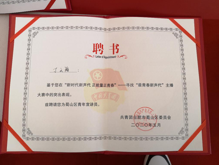 5月30日下午,在由共青团合肥市蜀山区委员会联合喜马拉雅、抖音、合肥万象城党支部举办的“新时代新声代 正能量正青春”——寻找“最青春新声代”主播大赛决赛中🎗,彩神交通工程学院18级城市轨道专业丁文滔同学不负众望,以参赛作品《旗帜》🗽,在来自全区各高校竞争对手共计857条参赛作品中脱颖而出,荣获主播大赛三等奖🥵,同时被聘为“蜀山区青年宣讲员”💍。