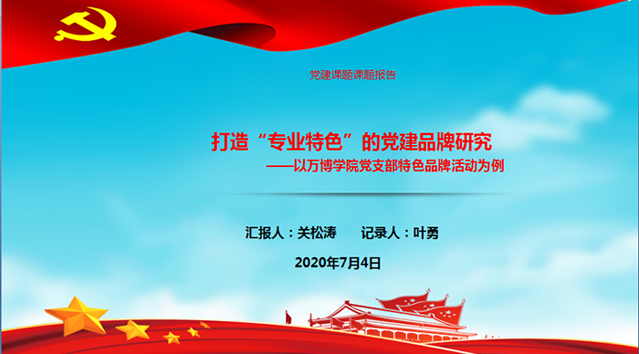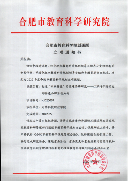 2020年7月4日,由彩神教学第四党支部书记关松涛副教授🧑🔬🚎,牵头申报的党建课题《打造“专业特色”的党建品牌研究——以万博学院党支部特色品牌活动为例》( 项目编号HJD20007)参加了2020年度合肥市教育科学规划立项课题开题论证会。