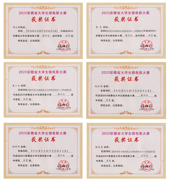 在安徽省教育厅公布的2020安徽省大学生微电影大赛中,艺术传媒学院积极组织学生参赛的30件作品⇾。其中19级广告班的郭亮🧜🏻♂️、柳文卿两位同学分别荣获微影评组优秀奖。