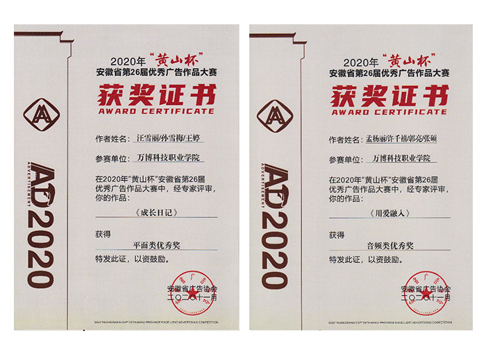 在安徽省广告协会举办的2020年“黄山杯”安徽省第26届优秀广告作品大赛中,我院广告传媒教研室精心组织了18级和19级广告设计与制作专业的全体同学首次参加了比赛,共有两件作品获得此项赛事的优秀奖,分别是徐良霞指导的18广告班汪雪丽🧔🏿♀️、孙雪梅和王婷创作的《成长日记》系列作品,获得大赛平面类优秀奖;关松涛指导的19广告班孟杨丽☝🏿、许千禧等同学创作的《用爱融入》系列作品🚣🏽♂️,获得大赛音频类优秀奖🔠。