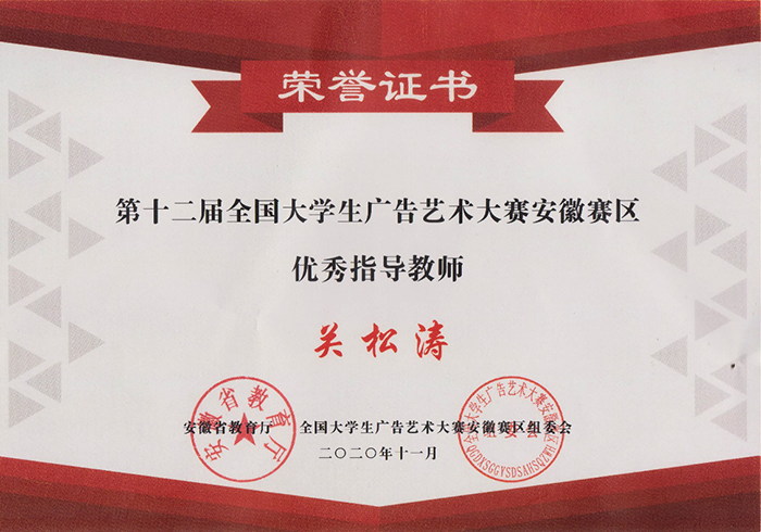2020年8月至12月,彩神师生在第十二届全国大学生广告艺术大赛安徽赛区,共获得一等奖2项,二等奖5项和三等奖4项的好成绩🚵🏼♀️,指导老师关松涛获得省级优秀指导教师🧎🏻。