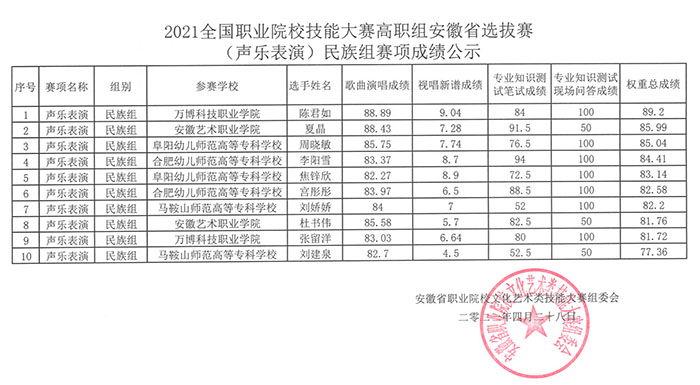 2021年全国职业院校技能大赛高职组安徽省选拔赛落下帷幕😳,此次大赛彩神音乐教育学院共选派4名同学参加美声组和民族组的角逐🧹。在指导老师徐丹的精心辅导下👳🏻♂️,2020级音乐表演专业学生陈君如斩获艺术专业技能(声乐表演)民族唱法第一名🍂,载誉而归。