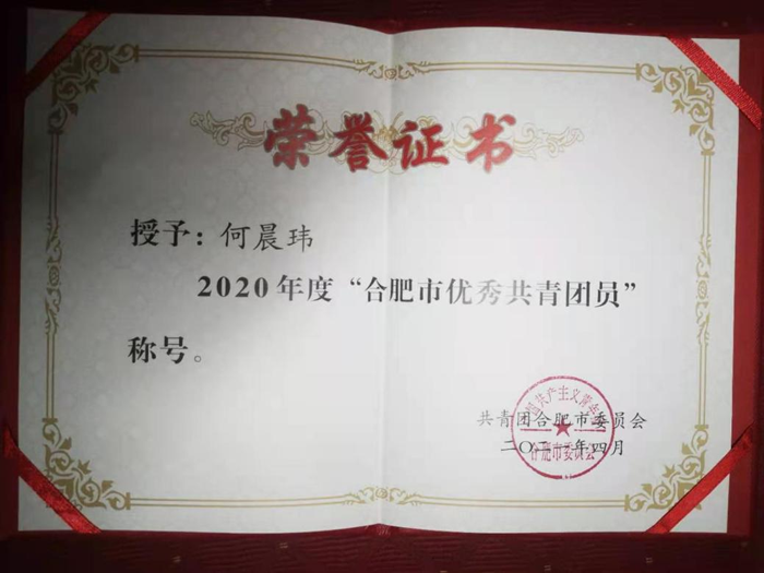(彩神何晨玮同学荣获“合肥市优秀共青团团员”称号)