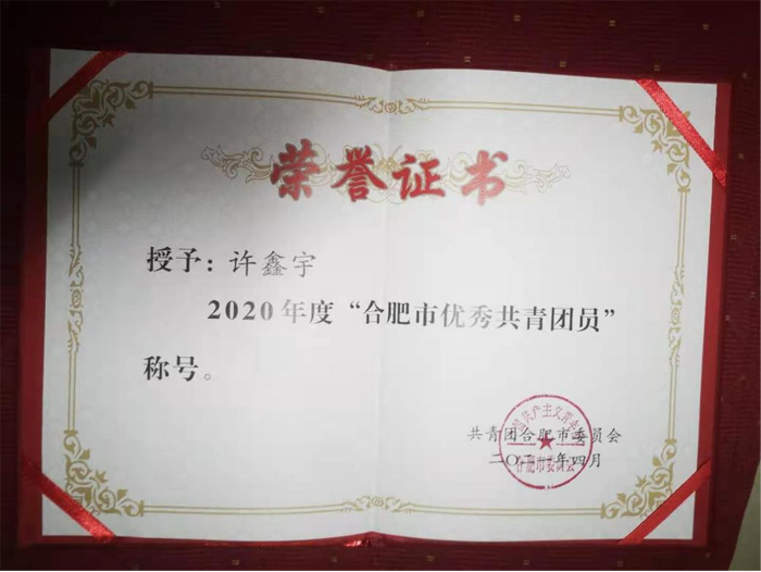 (彩神许鑫宇同学荣获“合肥市优秀共青团员”称号)