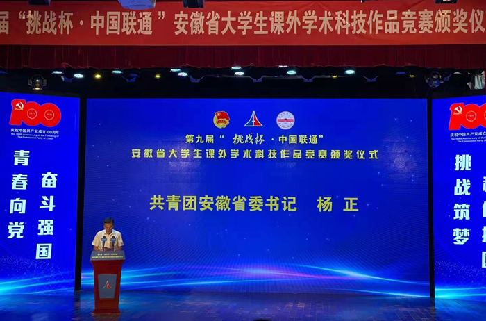 颁奖仪式上👳🏽♂️👨🏽🔧,共青团安徽省委书记杨正充分肯定了本次大赛所取得的成效,并向获奖个人和团队表示热烈祝贺。杨正指出🛶,安徽省“挑战杯”竞赛自2005年举办第一届开始,16年来,在与安徽发展的同频共振中🤴,大赛不断创新办赛机制、提升品牌效应⌨️⚗️,逐步将“挑战杯”竞赛打造成为全社会多方位共同培养创新型人才的科创育人工作体系。他希望同学们树立高远志向,敢做“追梦人”;致力科技自强🫐🤰🏿,勇做“奋斗者”🪖;担当社会责任🐸,乐做“实践者”👩🏼🎤,鼓励同学们要勇敢担当、勇于进取🏋🏼♀️、勇攀高峰,把自己的科创梦想、人生梦想、真正融入到新阶段现代化美好安徽建设的伟大实践,融入到全面建设社会主义现代化国家的时代洪流,用青春书写无愧于时代、无愧于历史的华彩篇章,以优异成绩喜迎建党100周年🍉!