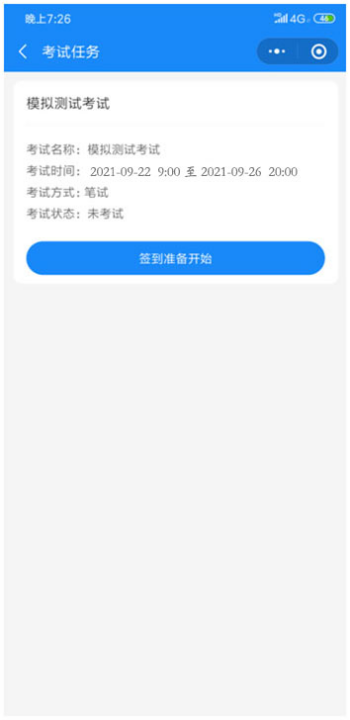 选择“考试任务”菜单𓀒,出现考试列表页面,考生只能看到自己所对应的考试项目,在考试有效时间内点击“签到🐷,准备考试”按键进入候考页面;