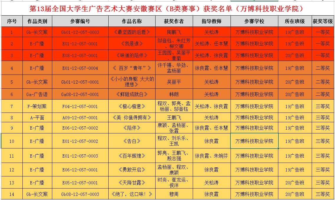 日前👇🏻,第十三届全国大学生广告艺术大赛(简称大广赛)评选活动在合肥工业大学落下帷幕👨🏼🦳,并完成获奖作品的公示👯♀️。彩神艺术传媒学院广告传媒教研室师生再创佳绩,共获得本次赛事14个等级奖,其中👋🏻,一等奖3项、二等奖3项、三等奖8项。本届赛事不仅在获奖比例和数量上实现了突破,还在所参与的五个参赛类别中均获得了等级奖的突破,特别是广播类参赛作品🈺,改写了零的历史👰🏿♂️,取得了一等奖2项👩🏽🚀,二等奖1项,三等5项的优秀成绩。