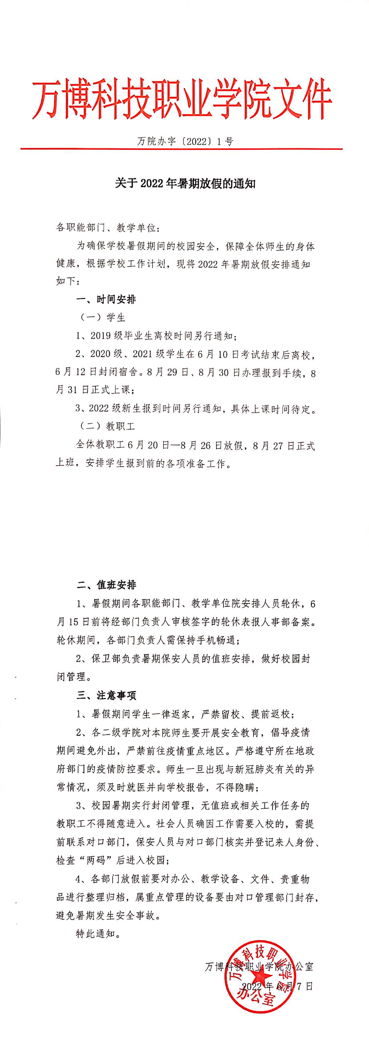 关于2022年暑期放假的通知