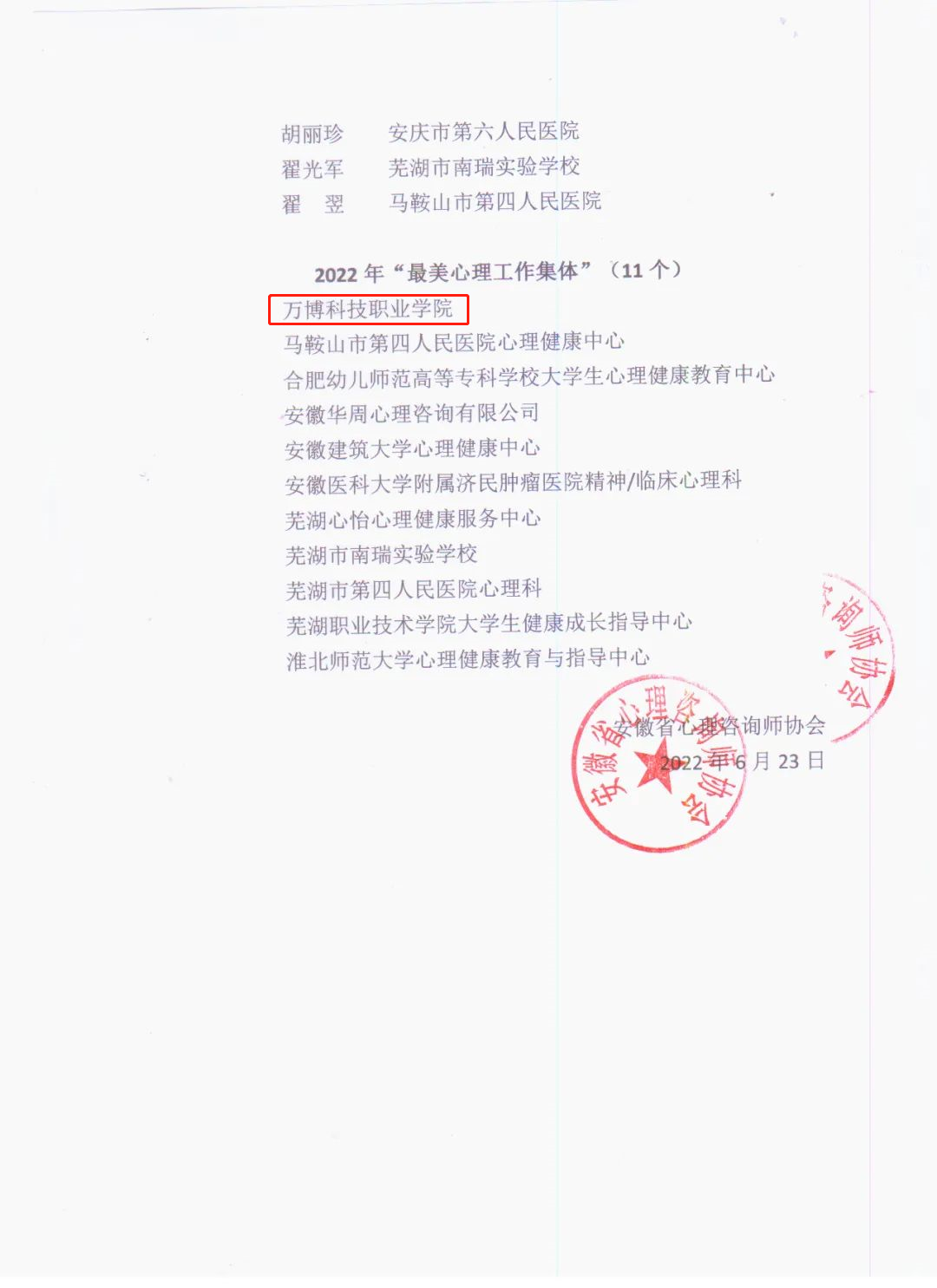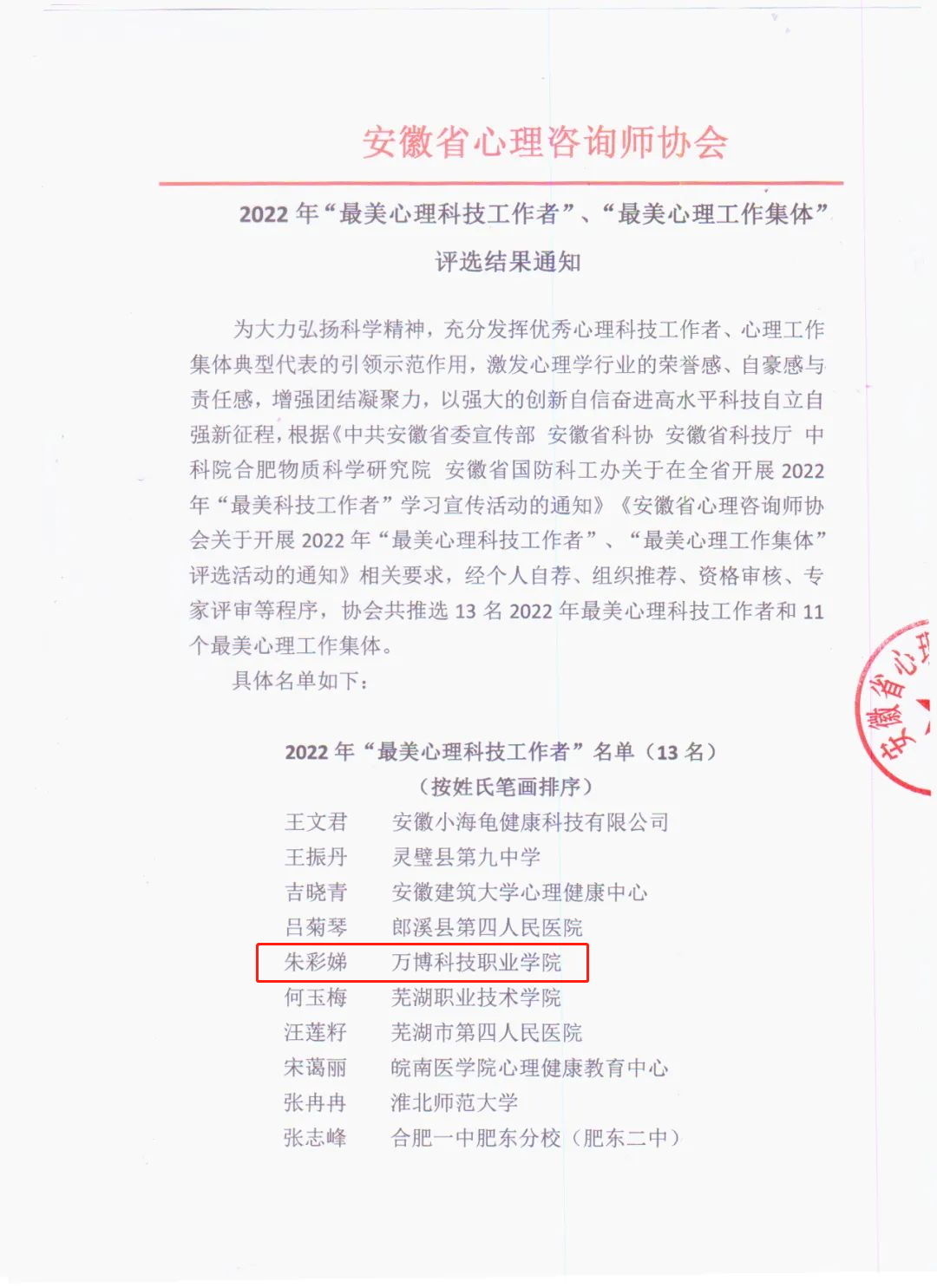 6月24日,经过层层选拔,彩神最终荣获2022年安徽省“最美心理工作集体”,朱彩娣老师荣获2022年安徽省“最美心理科技工作者”🤸🏻♀️🎄。