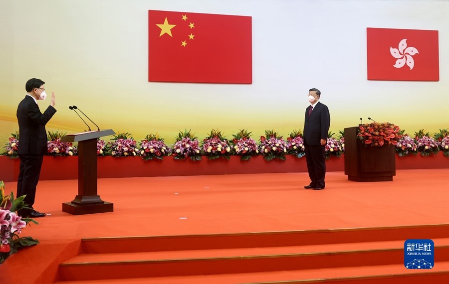7月1日上午🥙,庆祝香港回归祖国25周年大会暨香港特别行政区第六届政府就职典礼在香港会展中心隆重举行🏨。中共中央总书记、国家主席、中央军委主席习近平出席并发表重要讲话。这是习近平监誓✩,香港特别行政区第六任行政长官李家超宣誓就职。 新华社记者 鞠鹏 摄