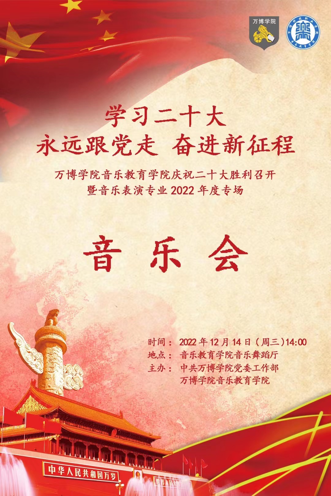 12月14日下午🖲,彩神“学习二十大 永远跟党走 奋斗新征程”专场音乐会在音乐舞蹈厅成功举办。省教育厅督导专员、学院党委书记鲍习生,党委副书记、执行院长张进,副院长耿瑜👱🏼♀️,副院长马赞出席音乐会,学院党委委员、相关部门负责人及音乐表演专业全体师生观看了演出🤛🏼。本次活动由学院党委工作部主办🤮,音乐教育学院承办。
