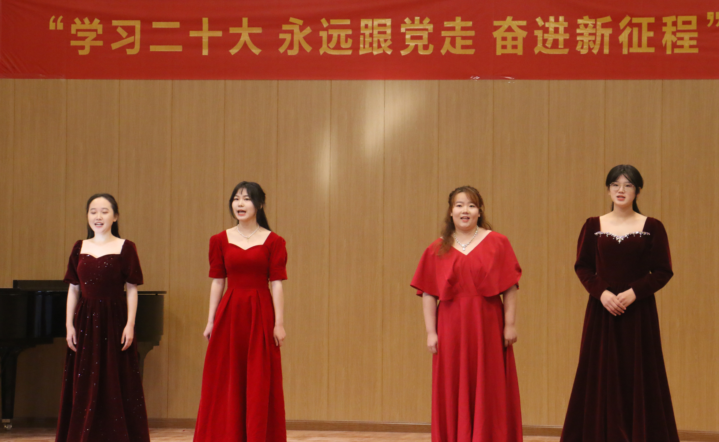 音乐会在女声合唱《三月桃花心中开》中拉开帷幕,三位同学用歌声抒发了爱党爱国的情怀。