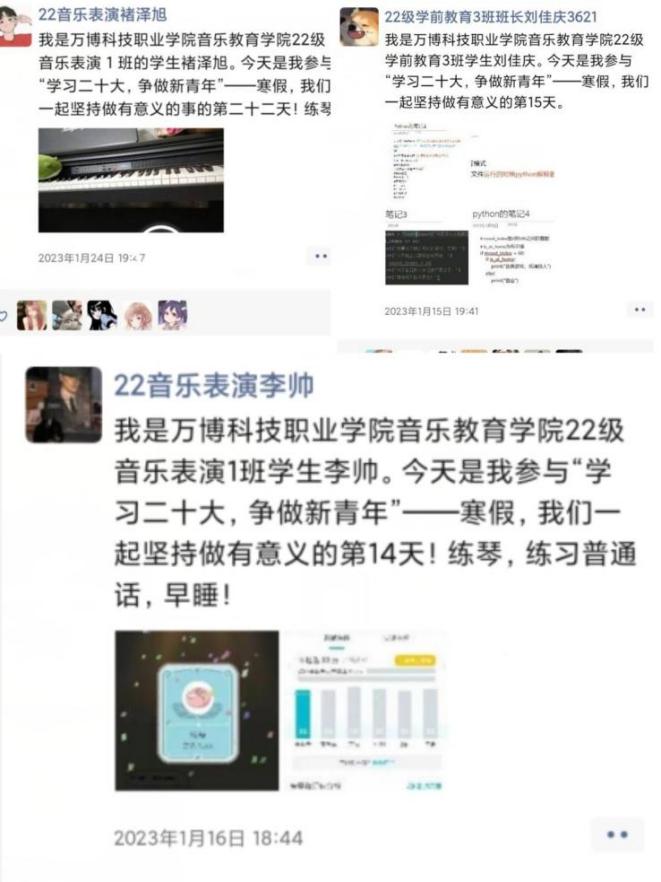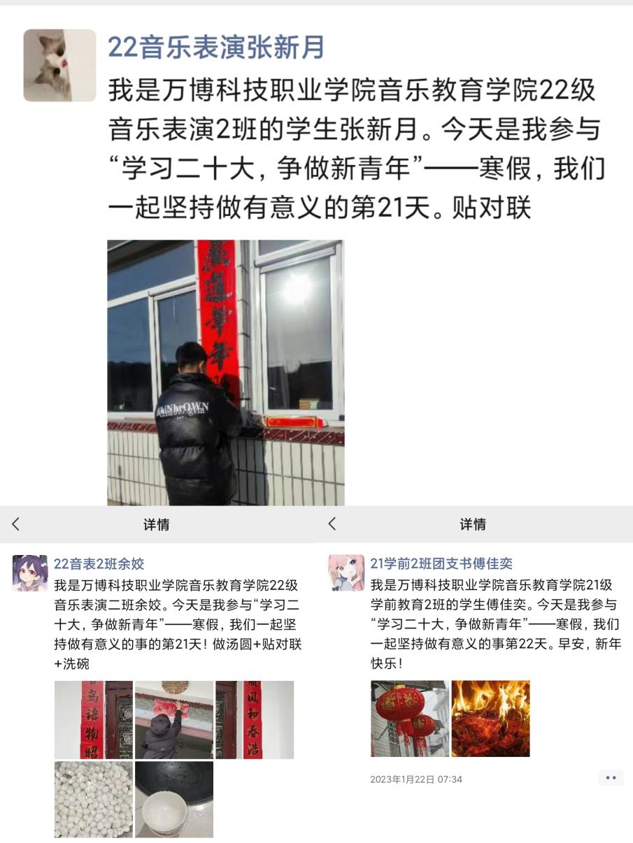为深入学习贯彻党的二十大精神,践行服务同学根本宗旨🙆🏿,音乐教育学院团总支学生会开展了“学习二十大🚆,争做新青年”寒假打卡活动。本次打卡活动由学习通道、体育锻炼通道📇、年味通道、假期实践通道四大板块构成,旨在让学生能够从多个角度、多个通道参与到活动中。