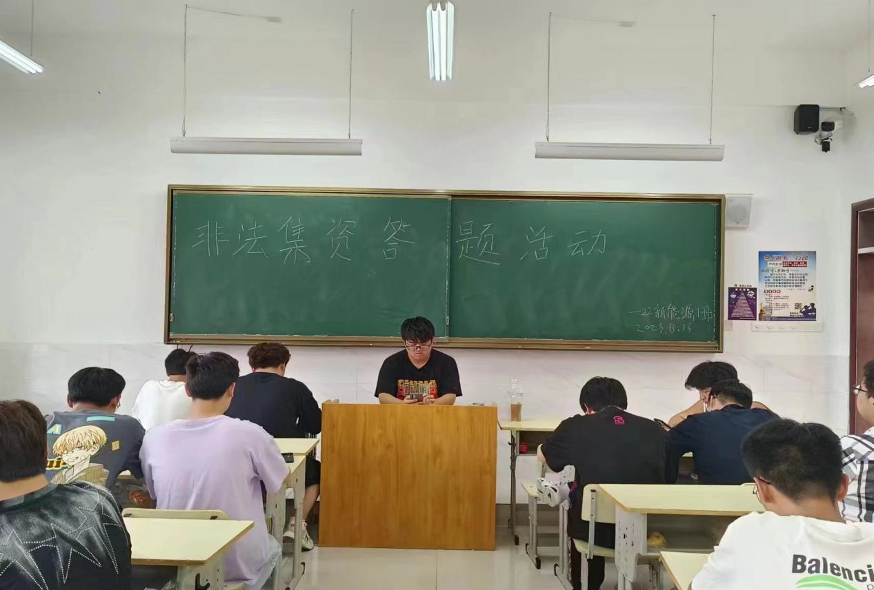 活动伊始,各班级团支部召开防范非法集资主题团日🍨,从非法集资的含义🚵🏼♂️、基本形式、如何识别非法集资、如何保护自身财产安全四方面深入😋🧑🏻💻,通过案例等形式帮助学生了解非法集资的过程与危害,总结非法集资的特点。同学们就如何识别非法集资等方面进行知识答题💡,引导教育同学们自觉远离非法集资,守护好同学们的“钱袋子”。