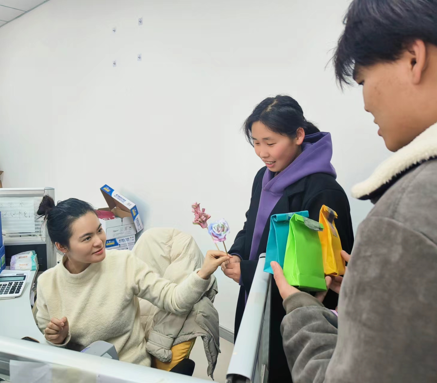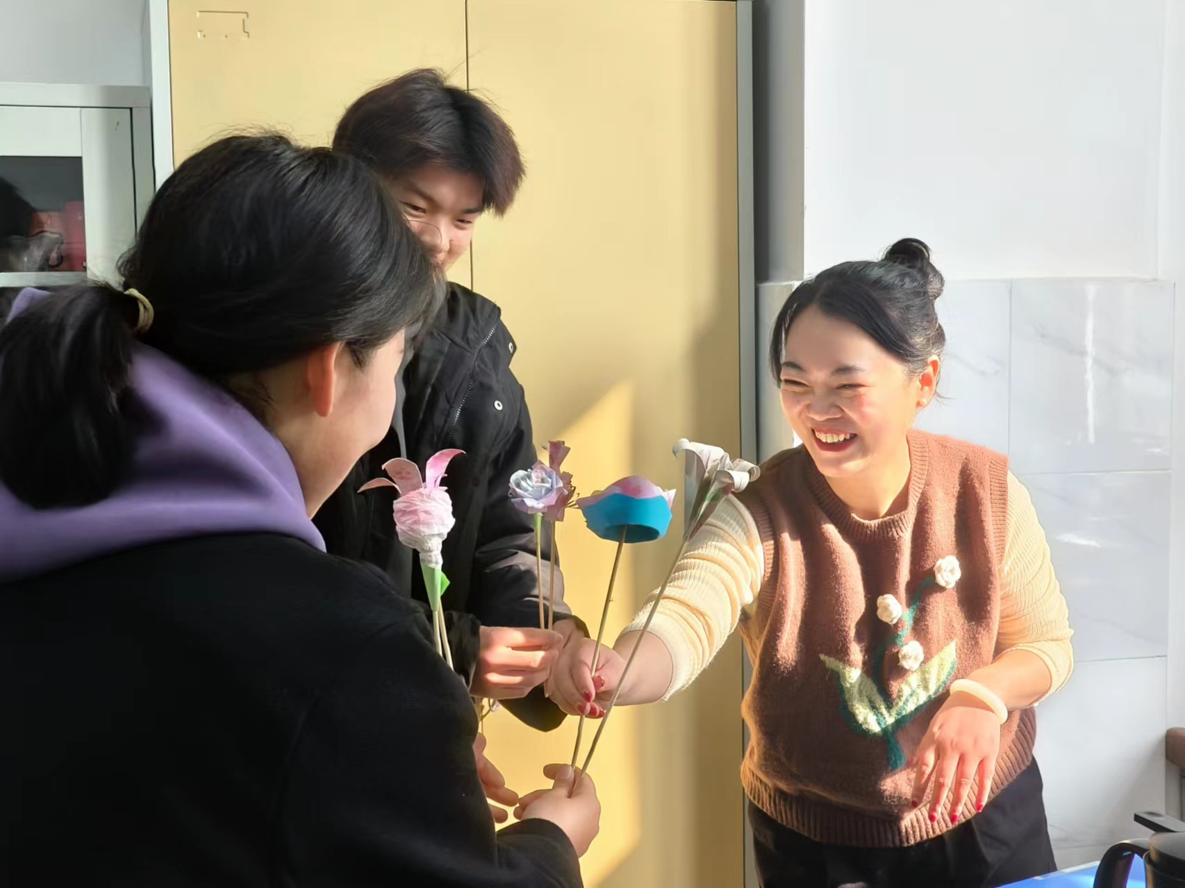 活动中,同学们精心设计了美丽别致的手工艺品。他们用餐巾纸做成的纸巾玫瑰和折纸百合含苞待放🫶🏼,用卡纸制成的精美礼袋,里面装着充满惊喜的“糖果盲盒”🤛🏽。礼物虽轻,胜在心意👩🏽🔬。办公室、宿管休息室、讲台上……学生们把一枝枝美丽的花朵和一个个充满祝福的礼袋送到女老师们手中,感谢她们为学校的发展贡献了智慧和力量,她们无不惊喜又感动👩🏿🏭,幸福的暖流弥漫在整个校园。