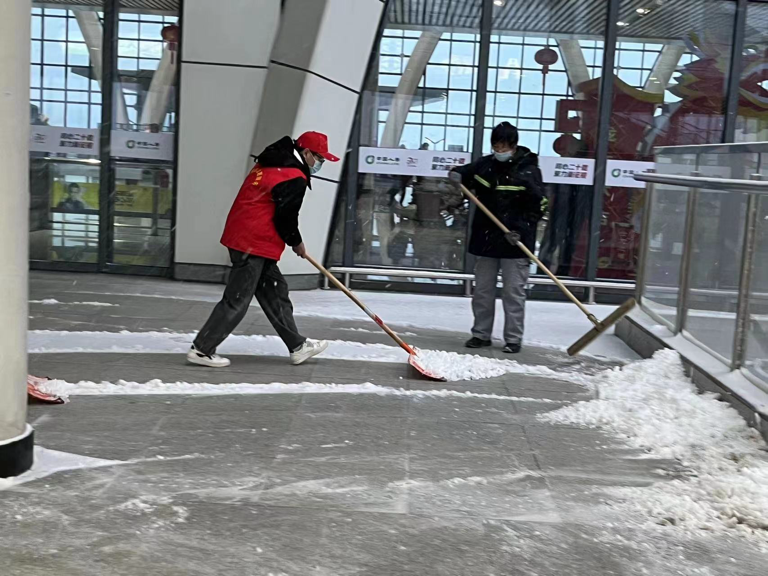 寒假期间🧓,我省多地出现大雪天气,为了旅客的安全与方便行动不便老年人的出行💗,每个站台和有人出行的过道,只要有雪花落下✯🙅🏿♂️,高铁站工作人员都会及时划分区域,有条不紊地进行铲雪、运雪,直至道路被清理得干干净净。