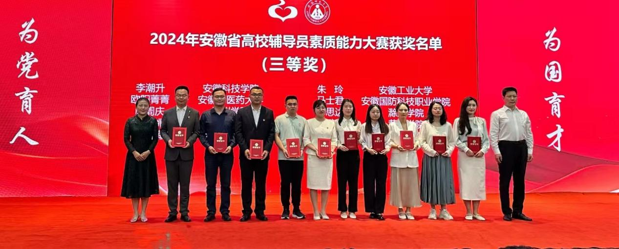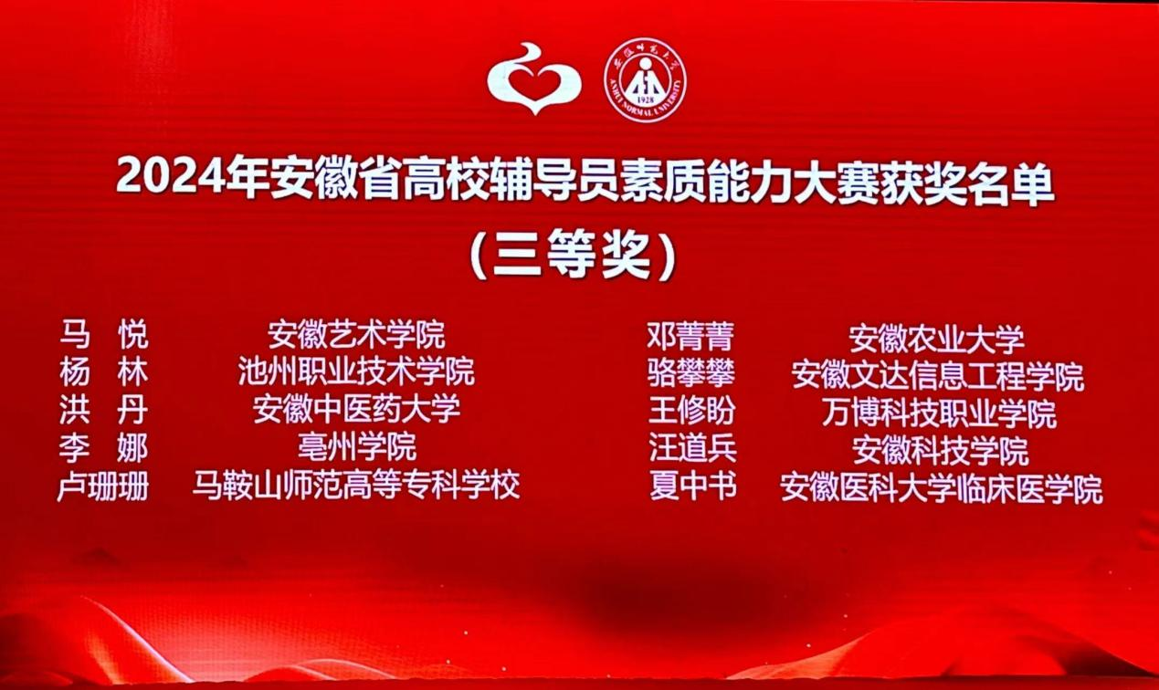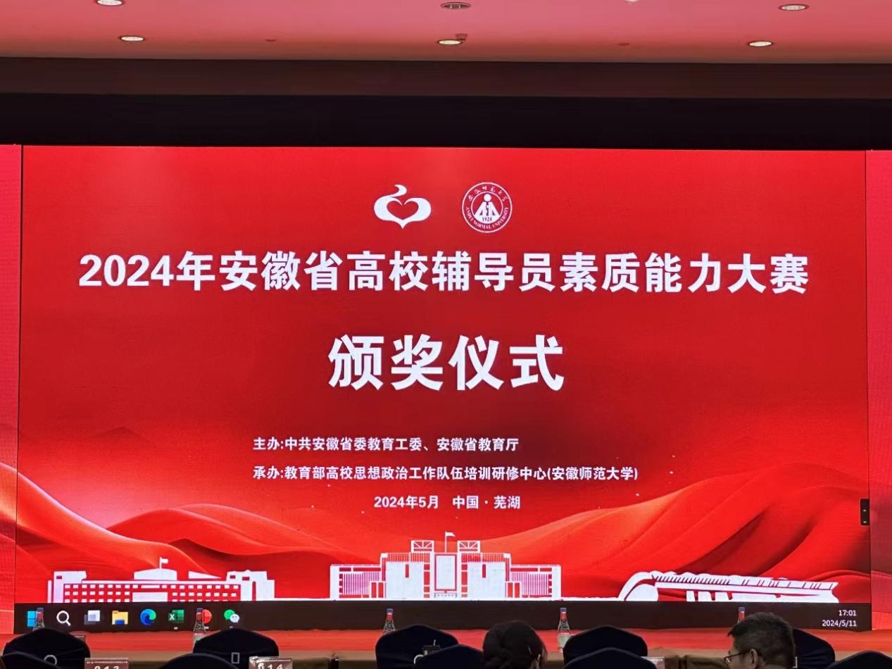 5月9日至11日,安徽省2024年高校辅导员素质能力大赛决赛于芜湖举行。本次大赛由中共安徽省委教育工委、安徽省教育厅主办,教育部高校思想政治工作队伍培训研修中心(安徽师范大学)承办,来自全省高校的144名本专科辅导员同场竞技。经过激烈角逐,彩神王修盼老师荣获大赛三等奖👩🏻🦱。