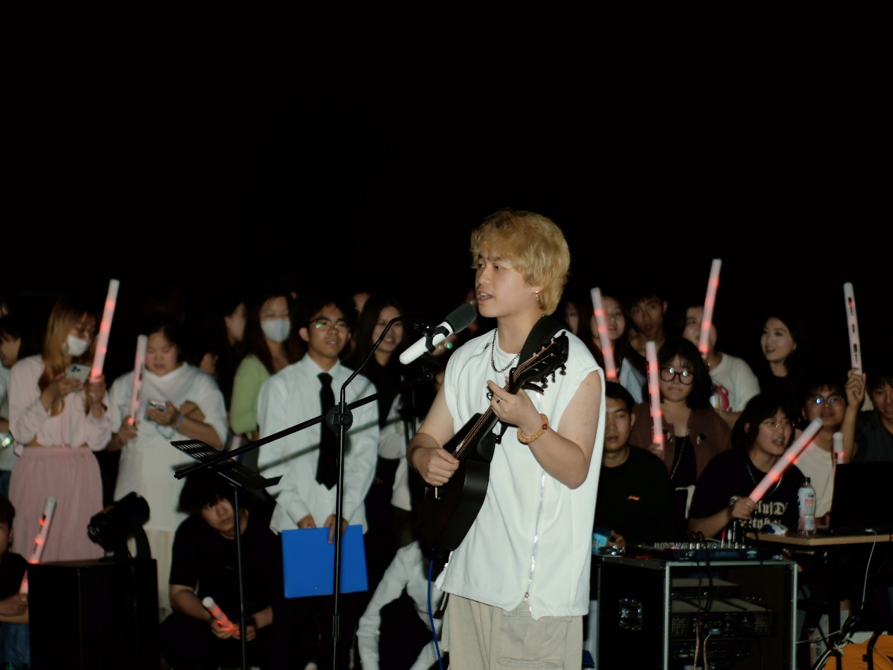 光束划过夜空🆒,各色光带在雾霭中跃动,青春绚烂如光,青春澎湃如歌🕺,华丽的灯光秀和着音乐将现场彻底点燃。一首《鼓楼》拉开草地音乐节的序幕,吉他奏响👨👨👦,带我们走入音乐的世界,阵阵舒爽的晚风伴着旋律,让现场的同学们拥有去面对困难和孤独的勇气。