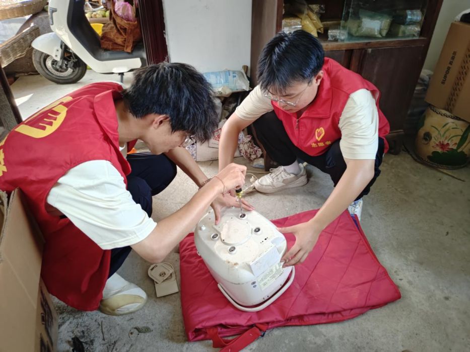 在村委会工作人员的带领下,队员们走家串户,充分发挥自身专业知识向老人们讲解家电使用注意事项,义务维修小家电。一位老人家拿出故障已久的电饭煲,两位队员熟练地拆开外壳,仔细检查线路和零件,找到故障所在并完成维修。队员们帮助行动不便老人家的院子里除草、打扫卫生📂、晾晒被子。