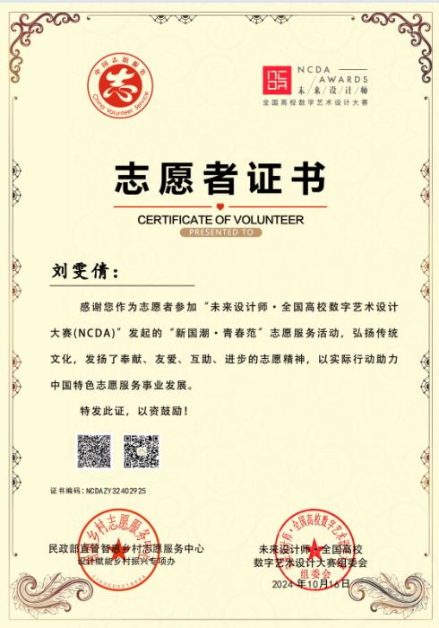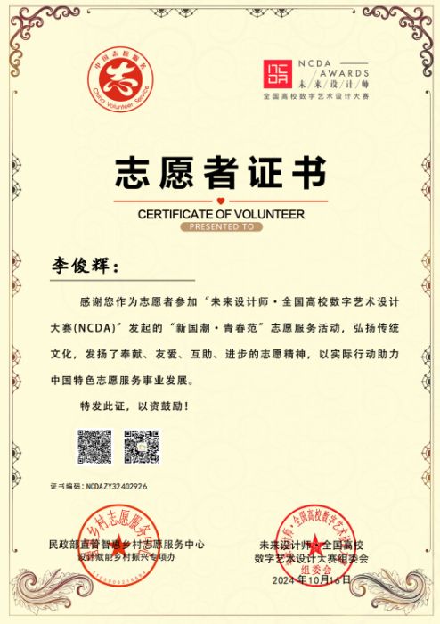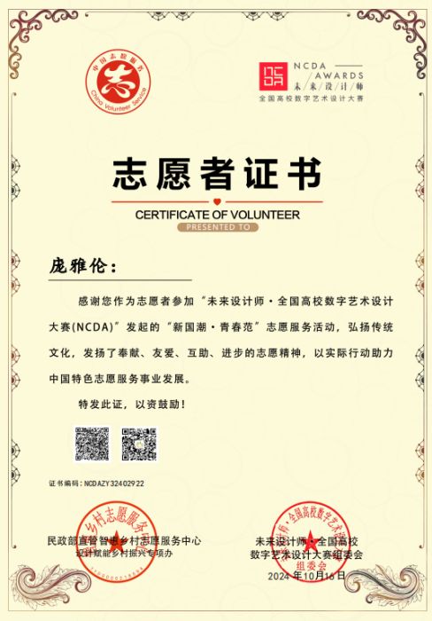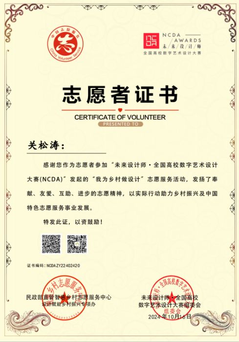 此外,为发挥学科竞赛“立德树人”功能,为弘扬奉献、友爱🧑🤳🏽、互助🚱、进步的志愿精神,表彰在的优秀者,未来设计师·全国高校数字艺术设计大赛委会与民政部智惠乡村志愿服务中心联合发起了第三届“我为乡村做设计”和“新国潮·青春范”志愿服务活动,彩神师生共有15人荣获志愿者证书🚅,进一步彰显了彩神师生在以专业知识对振兴乡村建设和社会服务积极响应与参与。