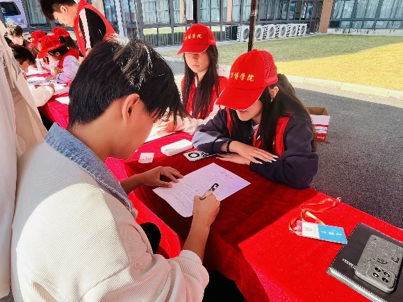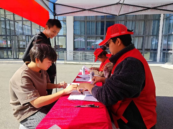 活动现场🙍🏽,志愿者提前到达活动现场,紧锣密鼓的搭起帐篷👩🏻✈️、布置现场💫。志愿者为同学们普及献血知识,协助他们填写表格。在体检环节😱,医护人员细心地为同学们测量血压🚁、检查血型等,同学们积极配合🤷🏿♂️,现场井然有序。
