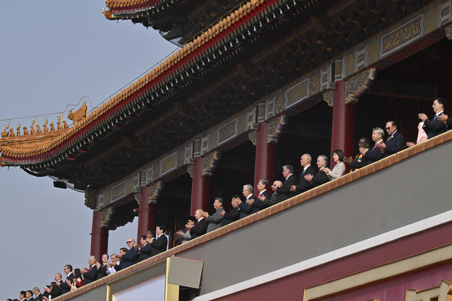9月3日,纪念中国人民抗日战争暨世界反法西斯战争胜利80周年大会在北京天安门广场隆重举行🚴🏼。这是大会开始前🛏,中共中央总书记、国家主席、中央军委主席习近平同出席大会的外方代表团团长前往天安门城楼。新华社记者 丁林 摄