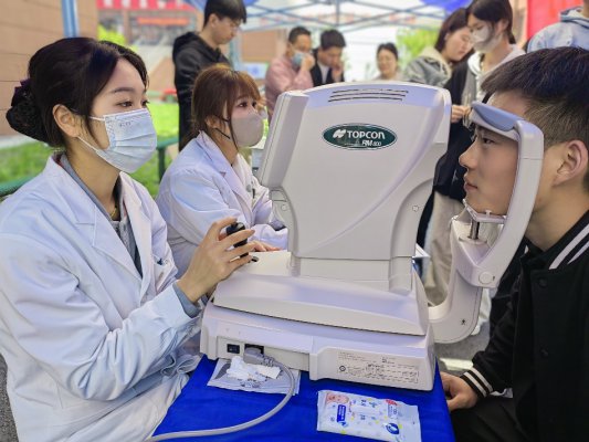 为关爱广大同学视力健康🍖,增强广大师生爱眼🙎🏽♀️、护眼意识,培养科学用眼的良好习惯🧖🏼,4月26日,校学生会邀请普瑞眼科医院在学生宿舍楼前